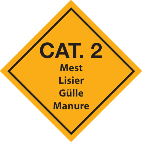 - Gele sticker met tekst voor transport in de Categorie 2 Mest in 4 talen. Regels hiervoor zijn opgesteld door de Nederlandse Voedsel- en Warenautoriteit.