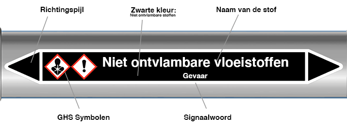 Leidingmarkering stickers voor "Niet ontvlambare vloeistoffen in het zwart met witte opdruk en waar van toepassing voorzien van de juiste GHS gevarensymbolen en signaalwoord.